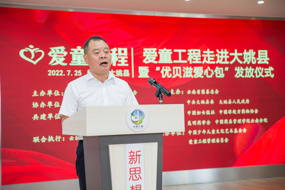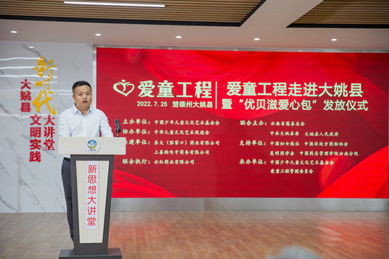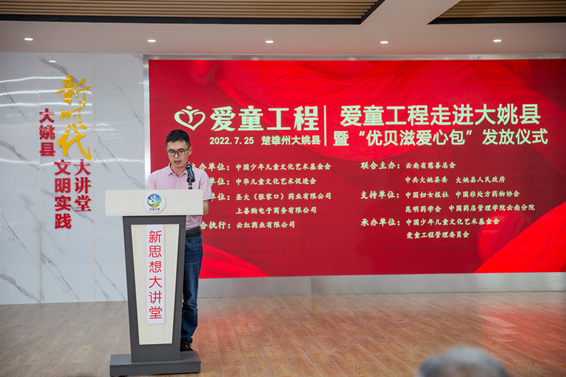 云紅藥業(yè)總監(jiān)王鵬代表聯(lián)合執(zhí)行單位發(fā)言,他表示,一定確保把“優(yōu)貝滋愛心包”安全配送到大姚縣每一位受益人手中,做好最后一共公里服務(wù),為兒童的健康發(fā)展實(shí)業(yè)貢獻(xiàn)自己的社會責(zé)任。