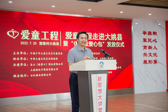 圣大(張家口)藥業(yè)有限公司公共關(guān)系總監(jiān)唐博勛作為愛童工程共建單位代表發(fā)言。圣大藥業(yè)自創(chuàng)立伊始就以中國少年兒童身心健康為己任,專注兒童用藥安全二十年!旗下“優(yōu)貝滋”兒科系列藥品,涵蓋?童常見病、多發(fā)病,解決了中國千萬家庭的兒童用藥安全問題。圣大藥業(yè)此次通過中國少年兒童文化藝術(shù)基金會和云南省慈善總會向大姚縣捐贈價值 238 萬元的“優(yōu)貝滋愛心包”,內(nèi)含書包、校服、學(xué)習(xí)用品等愛心物品,捐贈對象為全縣幼兒園和特殊教育學(xué)校的孩子共計 6800人。未來圣大藥業(yè)將繼續(xù)積極履行社會責(zé)任,用高品質(zhì)的產(chǎn)品和溫暖的公益行動守護(hù)少年兒童健康成長,與中國少年兒童文化藝術(shù)基金會一起,共同繪制鄉(xiāng)村發(fā)展的美好藍(lán)圖。