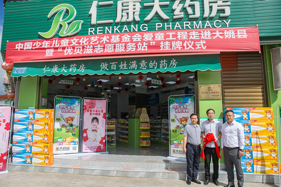 會后,全國首家愛童工程“優(yōu)貝滋志愿服務(wù)站”掛牌儀式在仁康大藥房大姚金龍店舉行。中國少年兒童文化藝術(shù)基金會愛童工程主任歐陽藝星、愛童工程委員、云南聯(lián)絡(luò)處主任謝隆、圣大藥業(yè)公共關(guān)系部總監(jiān)唐博勛、楚雄仁康商貿(mào)有限公司董事長王超共同為首家“優(yōu)貝滋志愿服務(wù)站”揭幕,家長憑“愛童工程愛心卡”到指定藥店免費(fèi)領(lǐng)取愛心物資。