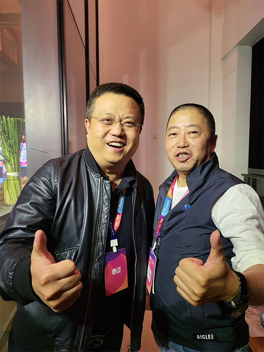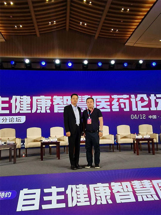 圣大藥業(yè)公共關(guān)系總監(jiān)唐博勛(右一)與烏鎮(zhèn)健康大會(huì)主席、全國政協(xié)委員、中國非處方藥物協(xié)會(huì)輪值會(huì)長、一心堂藥業(yè)集團(tuán)股份有限公司董事長阮鴻獻(xiàn)(左一)合影